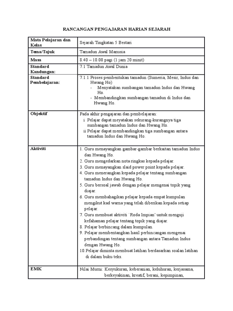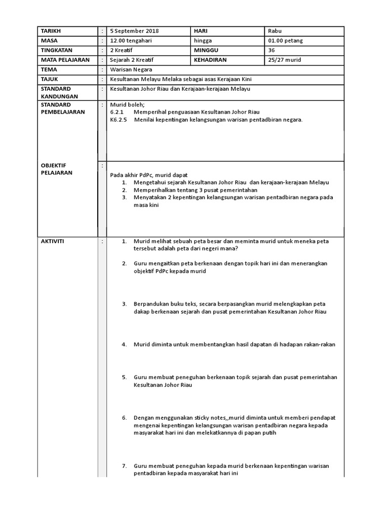 Blog ini dibina bagi membantu guru bakal guru dan sesiapa sahaja yang ingin menghasilkan Rancangan Pengajaran Harian RPH. Rancangan Pengajaran Harian Sejarah Tingkatan 2 Hari Tarikh. Kesultanan Melayu Melaka Sebagai Asas Kerajaan Masa Kini KOD STANDARD KANDUNGAN 64 Sarawak dan Sabah KOD STANDARD PEMBELAJARAN.