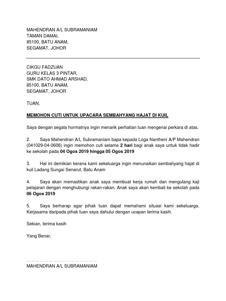 Saya ibu kepada muhamad farhan hafiz ingin memohon cuti bagi. Contoh surat permohonan cuti sekolah. Ibubapa boleh gunakan template simple Surat Cuti Sekolah dalam format PDF Ms Word ini untuk memohon cuti seperti cuti sakit bercuti luar urusan keluarga balik kampung.